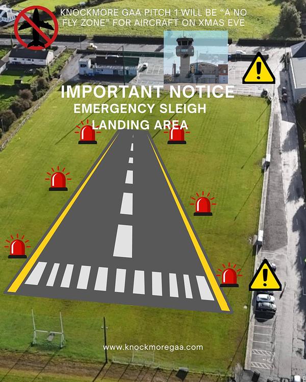 Our club chairman has given special permission to Santa Claus to use pitch 1 as an emergency landing area in the unlikely event of a sleigh incident over Knockmore tonight. The special plan is put in place below and a temporary air traffic control tower will be monitored throughout the night and we ask people not to park at the club after midnight. Santa has thanked the club and said there were no Knockmore children on the naughty list - however, a few adults were not so lucky!