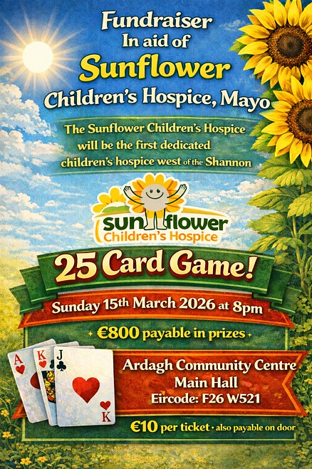 Ardagh Community are holding a 25 Card Game Fundraiser on Sunday 15th March at 8pm in Ardagh Community Centre (F26 W521). There will be €800 in prizes on the night.