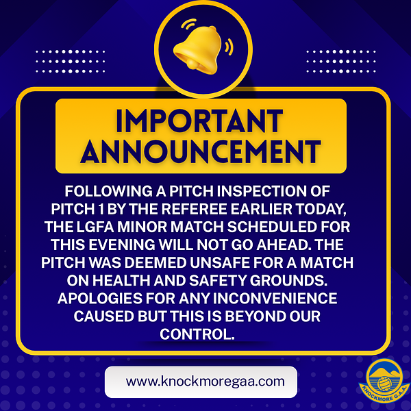 Following a pitch inspection by the referee this afternoon, Pitch 1 was deemed unfit for a game and in the interest of the health and safety of the players the LGFA minor match will NOT go ahead this evening in Knockmore. We apologise for any inconvenience caused but player safety has to be at the forefront of any decision with regard to games. Thank you all for your co-operation.