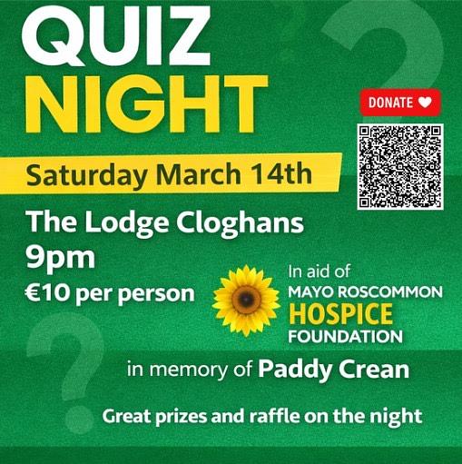 There will be a quiz in the Lodge in Cloghans on Sat 14th March