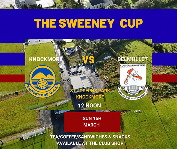 The Sweeney Cup Semi final takes place in Knockmore at 12 on Sunday 15th March. We extend a warm welcome to the Belmullet team, management and their travelling fans. There is ample parking available and our club shop will be open for refreshments before and during the match. Hopefully the weather will be kind to us.
