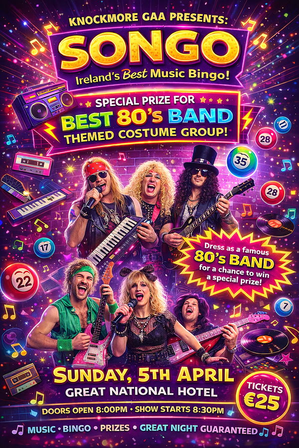 Get your 80’s groove on - get your friends together for a fun night and dress in your 80’s gear for a chance to win a very sweet prize. This promises to be a fun night - it’s something different for us and a great way to support our girls, boys, men and women who make up Knockmore GAA & LGFA.