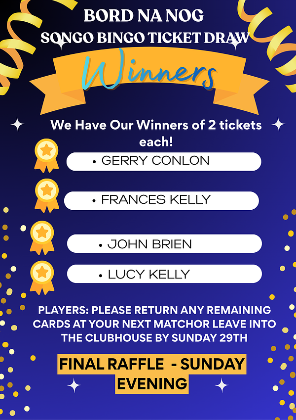 Winners of the first raffle for 2 Songo tickets each: Gerry Conlon , Frances Kelly, John Brien, Lucy Kelly. Players please return any remaining cards to your next match or training or leave into the club by Sunday 29th. Final raffle Sunday evening.