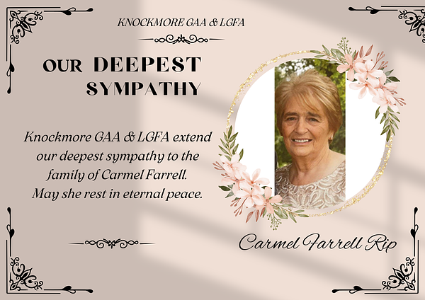 We at Knockmore GAA & LGFA wish to convey our deepest sympathy to the family of Carmel. Carmel and her late husband Des were instrumental down through the years in setting the roots for the club we have today - and these roots continue today with the current contributions made to the club by her children and grand children.